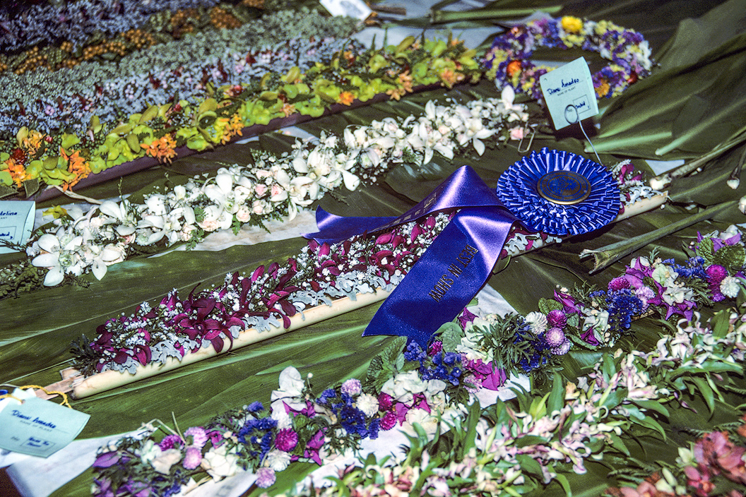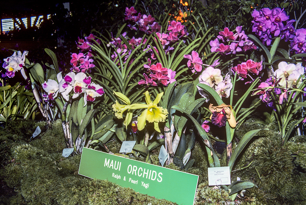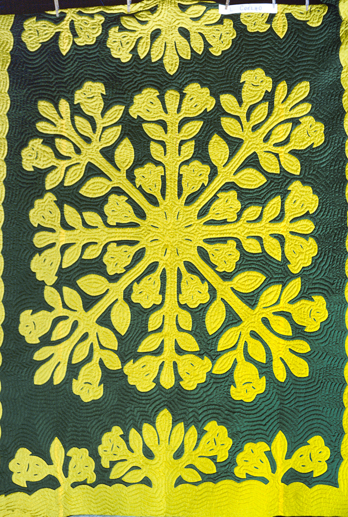 And last but not least is a beautiful traditional Hawaiian quilt — often four-way symmetrical using stylized images of local plants — the leaves and flowers. To me, this looks like an African Tulip — I wish I had found an identification card. Well, this marks the end of my first visit to the Maui County Fair — the first of many. I do apologize for the quality of my photos. My Minolta SLR using Kodachrome 64 film did not do it justice — which is why I have previously shared photos of more recent visits with better lighting and photographic equipment. Also, in more recent years, the Fair has been held in a different location and the building with the orchids has much better lighting for photography. But remember that you can always visit the Maui County Fair in person — it is a delightful experience. I understand that the 2022 Maui Fair has been canceled — again due to COVID. Cross your fingers and hope that the tradition can resume next year — it's a great one. Remember that it is traditionally held early in October — but do check well in advance if you are planning your visit. ![]() |