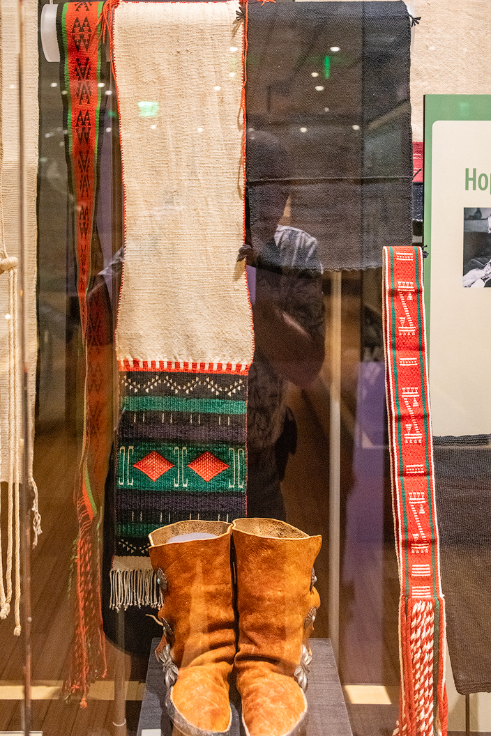 weaving is done by Hopi men and comes from a complex ancestral tradition of woven cotton. With the introduction of Spanish sheep, weavers added wool to their tool kit. Because weaving is done to produce ceremonial garments, it continued even with the introduction of machine-made cloth and the adoption of Western-style clothing.