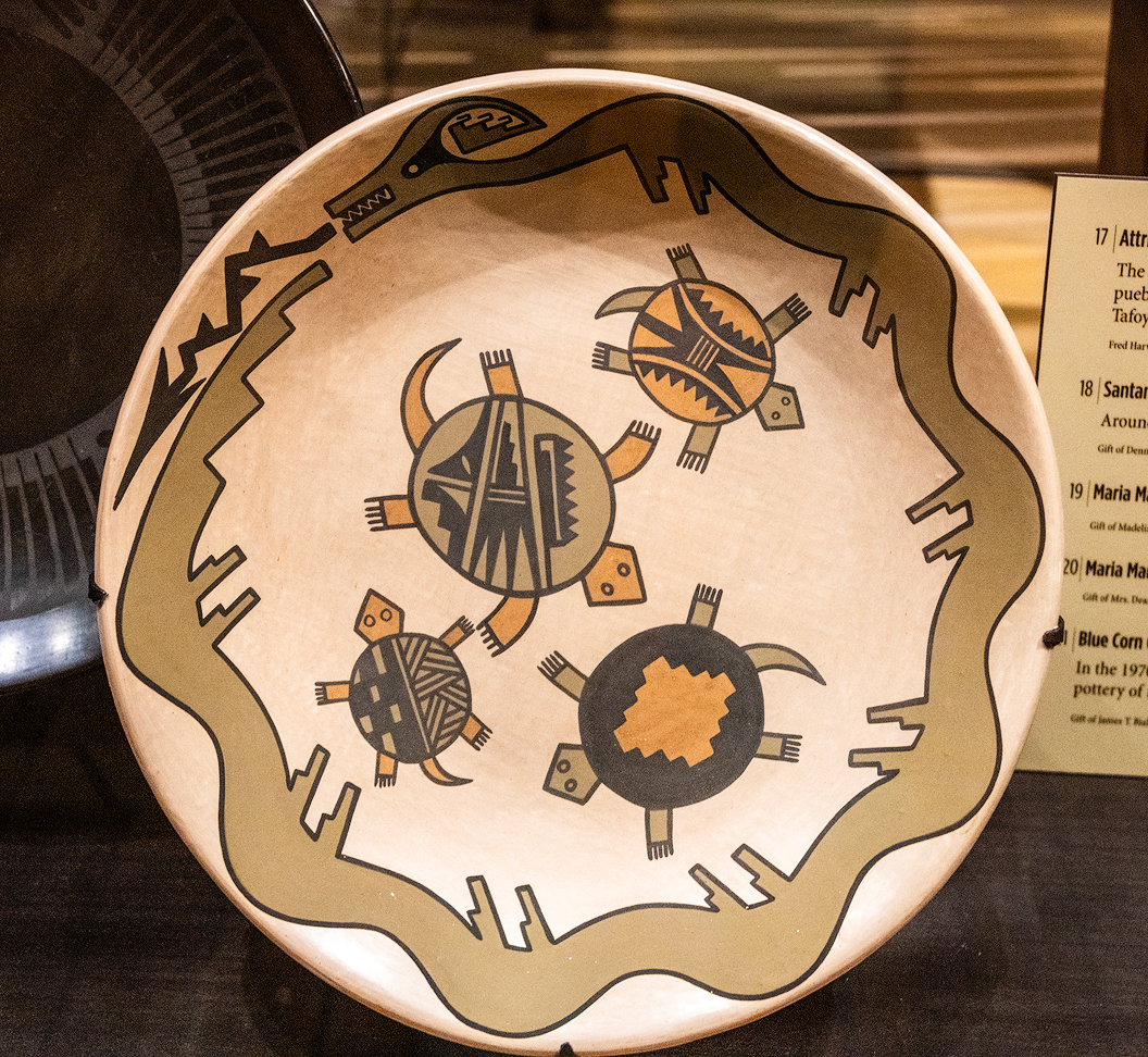 I found this example of Hopi pottery to be quite interesting — four desert tortoises with designs on their shells surrounded by a serpent with a tongue resembling lightning.