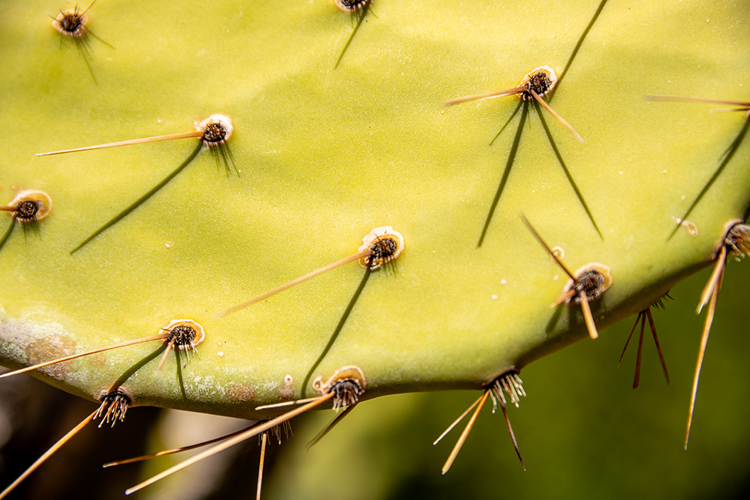 More help from Wikipedia, "In botany, areoles are small light- to dark-colored bumps on cacti out of which grow clusters of spines. Areoles are important diagnostic features of cacti and identify them as a family distinct from other succulent plants. The spines are not easily detachable, but on certain cacti, members of the subfamily Opuntioideae, smaller, detachable bristles, glochids, also grow out of the areoles and afford additional protection."