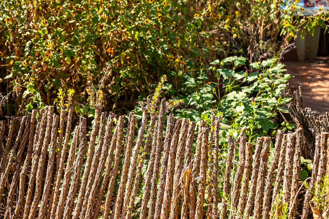 This barrier is protecting plants being grown for consumption or other uses. Look closely at the "sticks" used for the barrier. They have nasty thorns on them — which I recognize as ocotillo. These thorny sticks were quite effective in keeping out the varmints from any planted area. Note that we sell ocotillo at Lowe’s, so you could do the same thing in your garden. Ocotillo is also quite beautiful in the wetter months (or with irrigation) — tiny green leaves and beautiful bright crimson flowers.